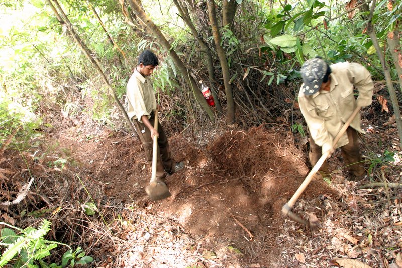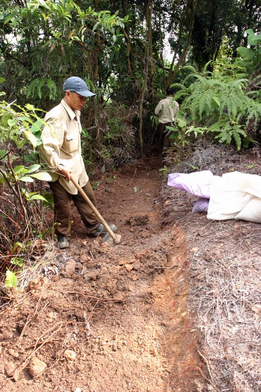 the trail is prep by 2 workers working their cangkul (hoe). Usually performed at a rate of 3mins for each trail metres. for granite chips, we can lay up to 5metres of the trail in 5 minutes, giving the trail the first layer of armoring easily.