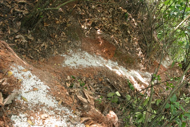 the trail is prep by 2 workers working their cangkul (hoe). Usually performed at a rate of 3mins for each trail metres. for granite chips, we can lay up to 5metres of the trail in 5 minutes, giving the trail the first layer of armoring easily.