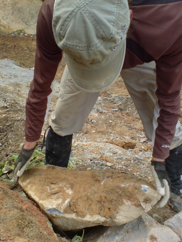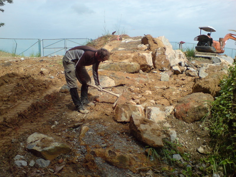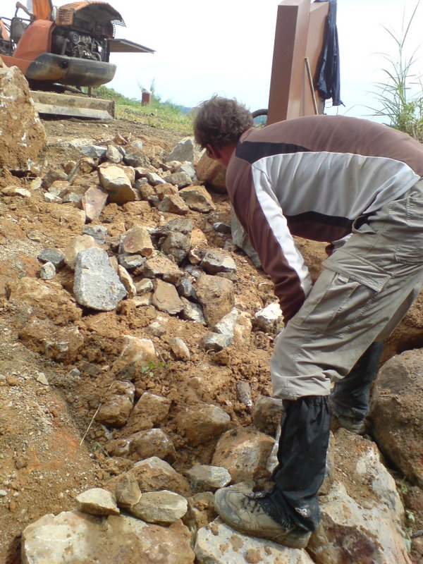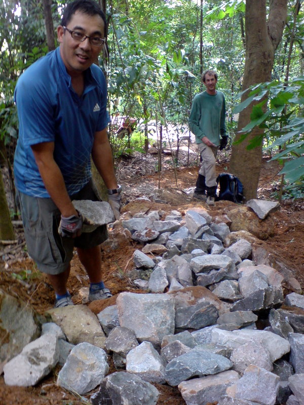 We choose to collect and move most of the 50kg rocks by hand, some by pure manual lugging and hugging. and is definitely challenging for 4 of us (Joey, Kee, ’55’ and me) with Hwa operating the excavator in support with pushing those 200kg and above stuff.