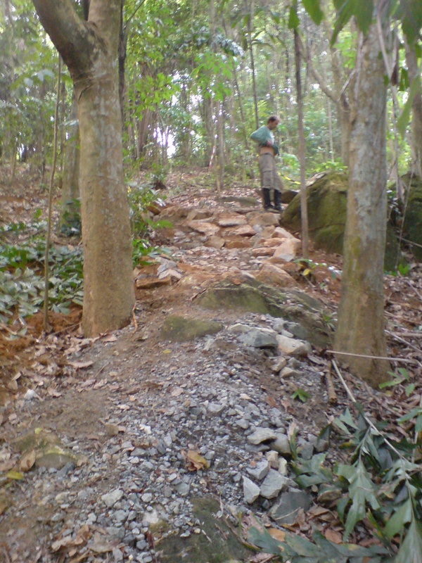 Monero and his helper got things going in the morning by getting our improvise old drainage slabs into the Precious descent. While they get barrow loads of slabs across, Wan Joo, the new park manager for Kent Ridge, and me got together for an overall plan discussion, and I made known the new plans on the map.
